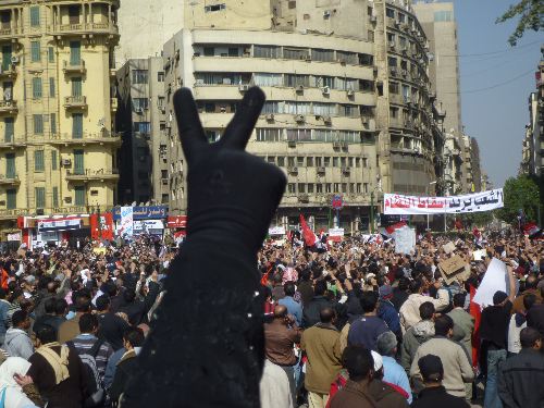 Mercredi 2 février 2011 dit"le mercredi noir" Non à l'injustice // Parmi les manifestants, une femme en niquab fait le V de la Victoire