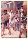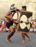 Les gladiateurs étaient partagés en plusieurs catégories, selon leur armement et leur façon de combattre. Le Samnite est la plus ancienne forme de la gladiature. Il était lourdement armé d'un casque, un bouclier long, une jambière gauche et une épée. A partir d'AUGUSTE les Samnites se divisent en Sécutores (opposés aux Rétiaires) et en Oplomachi (opposés aux Thraces). L'Oplomaque était revêtu d'une lourde armure alors que le Thrace était légèrement armé d'un petit bouclier rond, d'un casque, de 2 jambières, d'un brassard droit et d'un sabre court recourbé. Le Myrmillon ou Gaulois, coiffé d'un casque au cimier en forme de poisson et équipé d'un petit bouclier et d'une épée, était souvent opposé au Rétiaire, équipé d'un protège-épaule, d'un filet de pêche et d'un trident. Certains même combattaient à cheval (les Essédaires) ou en char. Les gladiateurs s'entraînaient dans des casernes spéciales, et leur maître, le lanista, les louait très cher à ceux qui offraient le spectacle. Certains gladiateurs pouvaient remporter de nombreuses victoires, l’un d’entre eux en comptabilise 50, ce qui ne les empêchait pas de mourir jeunes. Ces combattants portaient des surnoms qui les accompagnaient jusque dans la tombe, tels Ferox, Fulgur (rapide comme l’éclair) ou Ursius (qui a la force de l’ours). Nos élèves ont voulu mettre à jour certaines idées fausses concernant ces gladiateurs…