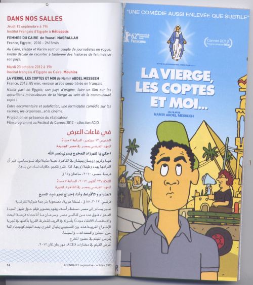 Il nous parle de son parcours, sa formation, ses expériences. Tarek Hassan a participé également au film de Namir Abdel Messeeh :"La Vierge, les coptes et moi…" sélectionné au Festival de Cannes 2012 et qui sera projeté au Caire à l'Institut français le mardi 23 octobre à 19h. M. Gazio, professeur de français, qui l'a vu à Paris nous fait partager son enthousiasme pour ce film.